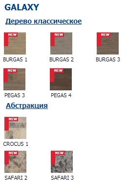 Что касается дизайна, Galaxy состоит из двух типов рисунков: "классическое дерево" разных оттенков (Burgas и Pegas) и абстрактных рисунков (Crocus и Safari).