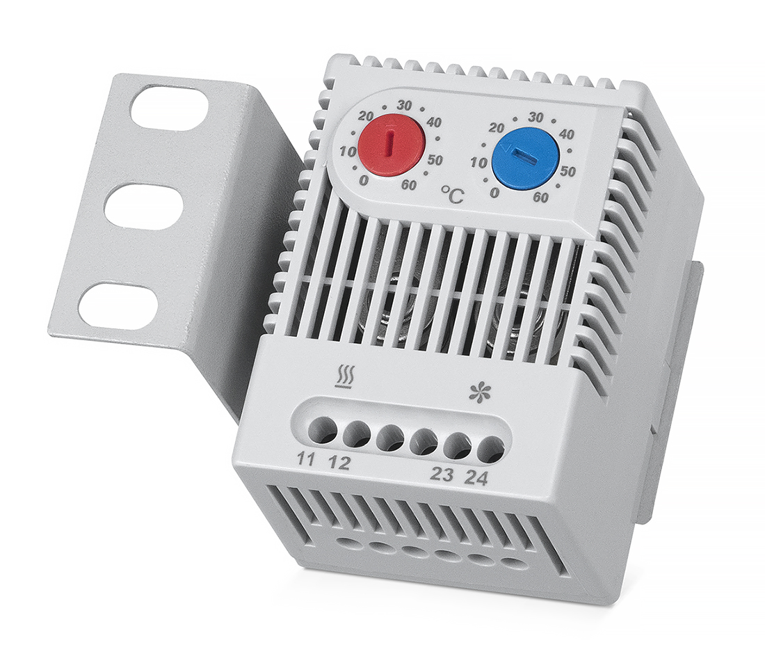 Термостат NO охлаждение/NC обогрев Cabeus ZR011 подключается в разрыв сети питания вентиляторного блока и нагревательного элемента. При достижении заданной температуры замыкается цепь и подается напряжение на вентиляторы или нагревательный элемент. Термостат поставляется вместе с креплением для установки на направляющие 19”.
