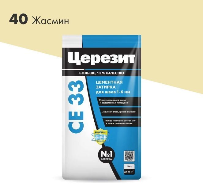 Затирка Церезит CE 33 1-6мм №40 жасмин 5кг - цветной цементный состав для заполнения узких плиточных швов. Предназначена для швов от 1 до 6 мм. В состав включены противогрибковые добавки, обеспечивающие защиту от образования пятен грибка и плесени. Состав предназначен для применения в сухих помещениях и помещениях с частым увлажнением (ванные, душевые, кухни и пр.), также допускается применение при производстве наружных работ (с поправкой на ширину шва - строго до 6 мм и стабильность основания - состав работает только по стабильным основаниям без риска возникновения деформаций). Может применяться для заполнения швов в плитке в небольших бассейнах. Следует обратить внимание на то, что в состав затирки CE 33 не входят гидрофобизирующие добавки, и при необходимости, швы после монтажа можно обработать гидрофобизирующей пропиткой для швов Ceresit CT 10 или рассмотреть приобретение затирки Ceresit CE 40, в состав которой уже входят все необходимые компоненты. Предназначена для всех видов плитки: керамической, керамогранита, из натурального камня и стеклянной мозаики. Наносится методом шламования, поэтому следует с особой осторожностью применять на облицовке с рельефной поверхностью котто или клинкерной плитке. Особенности: мелкофракционная сухая смесь обеспечивает гладкий шов предназначена для узких швов от 1 до 6 мм есть противогрибковые добавки нет гидрофобизирующих добавок палитра в 26 цветов продается в пакетах по 2 кг, 5 кг и 25 кг не имеет химической стойкости предназначена только для стабильных оснований.