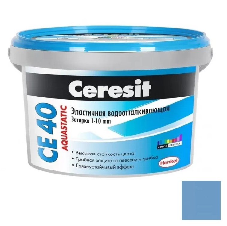 ЦЕРЕЗИТ CE А 40 (цвета - голубой) - водоотталкивающая затирка с противогрибковым эффектом для швов плиточных облицовок. Используется для заполнения швов керамических, стеклянных и каменных облицовок шириной до 10 мм, на полах и стенах, при внутренних и наружных работах, в гражданском и промышленном строительстве. Затирка приобретает заявленный цвет по истечении 24-48 часов в зависимости от условий окружающей среды после затирания швов.