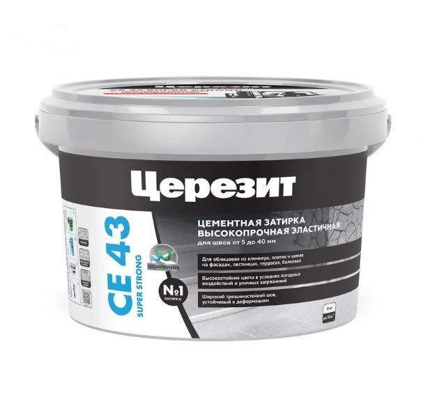Затирка Церезит CE 43 высокопрочная №16 графит 2кг – цветной цементный состав с укрупненной фракцией заполнителя для заполнения широких плиточных швов. Предназначена для швов от 5 до 40 мм. Такие плиточные швы чаще всего выполняются при облицовке клинкерной плиткой, фасадной плиткой под кирпич или натуральным облицовочным камнем. Раствор имеет специальные пластифицирующие добавки, обеспечивающие прочность особо широких швов. В состав включены противогрибковые и гидрофобизирующие добавки, обеспечивающие защиту от образования пятен грибка и плесени и создающие водоотталкивающий эффект. Затирка крупнодисперсная, имеет слегка шероховатую фактуру, приближенную к виду кладочного раствора. Но при укладке может быть заглажена до практически гладкой. Стойка к загрязнениям, сохраняет цвет и легко очищаема. Является эластичной, и может применяться по основаниям, подверженных деформациям - по теплым полам, по гипсокартону, ДСП, на террасах и балконах и т.п. Оптимальная для применения при фасадной облицовке и укладке плитки на полах в зонах с высокими нагрузками (промышленные залы, торговые центры, вокзалы и пр.). Предназначена для всех видов плитки: керамической, керамогранита, клинкерной плитки, натурального камня и фасадного декоративного камня. Наносится методом шламования, поэтому следует с особой осторожностью применять на облицовке с рельефной поверхностью котто или клинкерной плитке. Может наноситься с применением шприц-пистолета или кулька. Не рекомендуется к применению на поверхностях, подвергающимся интенсивным химическим нагрузкам (воздействие кислот и щелочей в высокой концентрации).