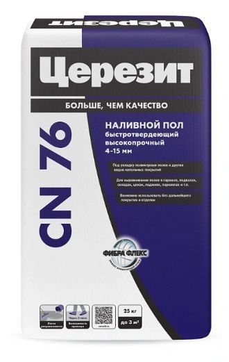 Церезит смесь самовыравн. CN 76/25 (25кг) - высокопрочный самовыравнивающий наливной пол на цементной основе (от 4 до 15 / 50 мм). Самовыравнивающаяся смесь CN 76 предназначена для выравнивания бетонных и цементно-песчаных оснований пола, а также для изготовления стяжек, подверженных значительным механическим нагрузкам (в цехах, складах с вилочными погрузчиками, гаражах, на автостоянках, рампах, спортивных аренах и т.п.), внутри и снаружи зданий. Может применяться как без покрытия, так и в качестве основания под укладку наливных полимерных, каучуковых и других видов покрытий. При необходимости формирования уклона смесь готовится с более вязкой консистенцией.