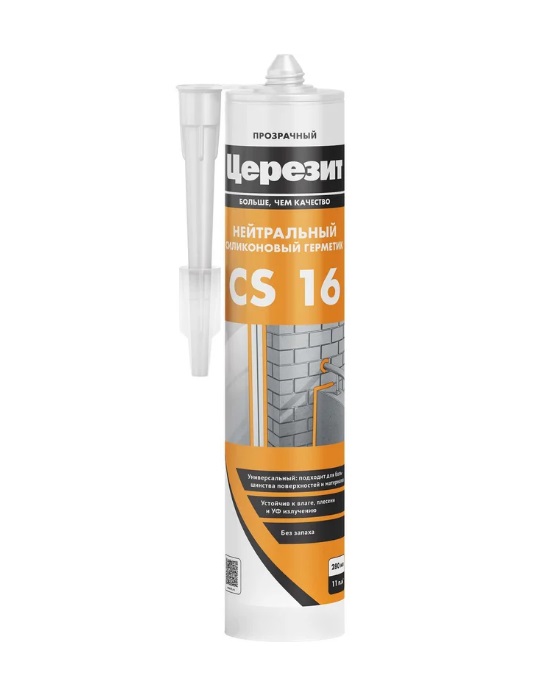 Герметик Церезит CS 16 нейтральный прозрачный 280мл - однокомпонентный низкомодульный герметик нейтральной вулканизации с превосходной адгезией к таким материалам как стекло, керамика, эмаль, металлы (алюминий, цинк, медь и т.д.), пропитанная, покрытая лаком или окрашенная древесина, пластики (ПВХ, эпоксидные смолы, полиэстер, полиакрилаты), щелочные основания (бетон, строительные растворы). Обладает превосходными характеристиками для профессионального применения и высокой атмосферостойкостью. Герметик силиконовый Ceresit CS 16 предназначен для герметизации деформационных швов в строительстве, санитарных швов во влажных помещениях (ванных комнатах и душевых), герметизации соединений в остеклениях и несущих конструкциях, в кораблестроении, автомобильной, электротехнической и электронной промышленности. Может быть использован для крепления зеркал. Поставляется в картриджах объемом 280 мл. Для использования необходим специальный строительный пистолет для герметиков.