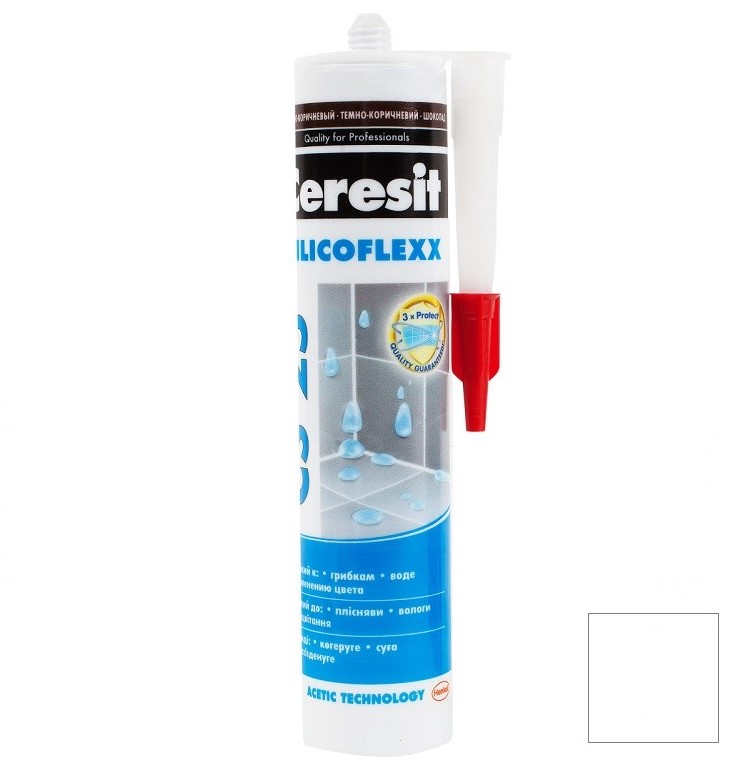 Затирка силиконовая Церезит CS 25 не имеет адгезии к резине, битуму, гудрону, тефлону, полиэтилену и материалам, выделяющим масла, пластификаторы или растворители. Содержит фунгициды и при отверждении выделяет уксусную кислоту, поэтому не пригодна для контакта с пищевыми продуктами, питьевой водой, мрамором, известняком, зеркалами, корродирующими металлами (свинцом, медью, цинком, железом) и герметизации аквариумов.