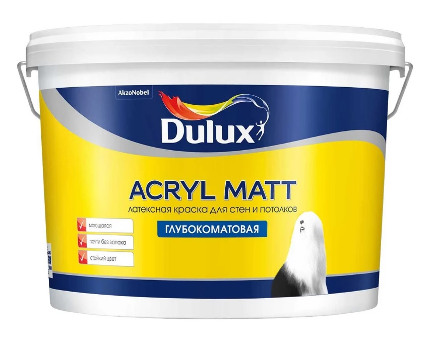 Краска Dulux Acryl Matt (BW) (9л/13,2кг) - глубокоматовая латексная краска для стен и потолков. Обладает отличной укрывистостью, экономично расходуется, легко наносится без брызг и потеков. Обладает всеми преимуществами акриловой краски: не имеет резкого запаха, образует эластичное покрытие, не изменяет цвет с течением времени. Образует глубокоматовое покрытие, позволяя скрыть небольшие дефекты поверхности. Экологичность подтверждена эко-сертификатом Листок Жизни. Рекомендована для применения в детских и лечебно-профилактических учреждений. Для внутренних работ. Краска Dulux Acryl Matt подходит для нанесения на полностью просохшие минеральные поверхности (бетон, штукатурка, кирпич и т. п.), гипсокартон, обои под покраску. Рекомендуется для окраски помещений с умеренной влажностью, таких как спальня, гостиная, кабинет, кладовка, столовая, раздевалка и т. п. Способ применения: перед применением разбавить в рекомендованной пропорции и тщательно перемешать. Рекомендуется наносить в два слоя при температуре от +5 °C до +30 °C, относительной влажности воздуха от 40 до 80 %. Используйте кисть с синтетическим ворсом, валик для водно-дисперсионной краски или распылитель.