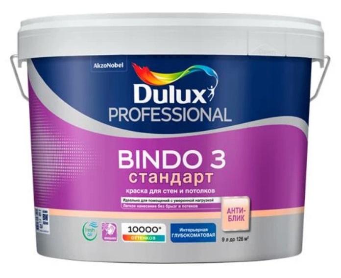 Краска Dulux Prof Bindo 3 BW (18л/26,8кг) - глубокоматовая водно-дисперсионная краска для высококачественной отделки стен и потолков в помещениях со стандартной нагрузкой, таких как спальни, гостиные, детские, кабинеты. Антибликовое покрытие отлично маскирует мелкие дефекты поверхности. Тиксотропная: наносится без брызг и потеков, легко разравнивается с нейтральным запахом. Особенности применения: перед применением тщательно перемешайте. Для укрепления базовой поверхности, повышения адгезии и уменьшения расхода краски загрунтуйте подготовленную поверхность грунтовкой Dulux Bindo Base. Краску рекомендуется наносить в 2 слоя при температуре воздуха и поверхности +5…+30 °С и влажности воздуха от 40 до 80%. Разбавление: при необходимости не более 1 части воды на 10 частей
