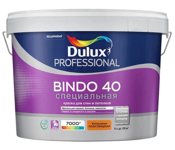 Краска Dulux Prof Bindo 40 BW (9л) - полуглянцевая водно-дисперсионная краска, разработанная специально для усиленной защиты стен и потолков в помещениях с повышенной нагрузкой и повышенной влажностью. Стойкая к перепадам температур, защищает от конденсата и плесени. Тиксотропная: наносится без брызг и потеков, легко разравнивается с нейтральным запахом. Способ применения: перед применением тщательно перемешайте. Для укрепления базовой поверхности, повышения адгезии и уменьшения расхода краски, загрунтуйте подготовленную поверхность грунтовкой Dulux. Краску рекомендуется наносить в 2 слоя при температуре воздуха и поверхности +5…+30 °С и влажности воздуха от 40 до 80%.