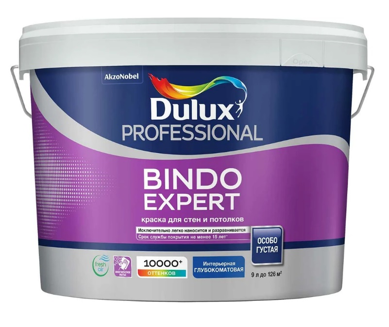 Краска Dulux Prof Bindo Expert BC (9л/11,3кг) - глубокоматовая водно-дисперсионная краска для высококачественной отделки стен и потолков. Благодаря особо густой консистенции краска обладает высокой тиксотропностью: быстро наносится без потеков и брызг, легко разравнивается, комфортна в работе с нейтральным запахом. Обладает высокими декоративными свойствами, визуально скрывая небольшие дефекты поверхности. Способ применения: перед применением тщательно перемешайте. Для укрепления базовой поверхности, повышения адгезии и уменьшения расхода краски, загрунтуйте подготовленную поверхность грунтовкой Dulux. Краску рекомендуется наносить в 2 слоя при температуре воздуха и поверхности +5…+30 °С и влажности воздуха от 40 до 80%.
