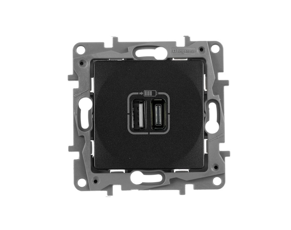 ETIKA Розетка IEK (Legrand) USB A+C 15Вт антрацит предназначена для зарядки переносных устройств, таких как: телефоны, смартфоны, планшеты, ПК, MP3 и MP4 плееры, динамики, часы, игровые консоли, внешние аккумуляторы.