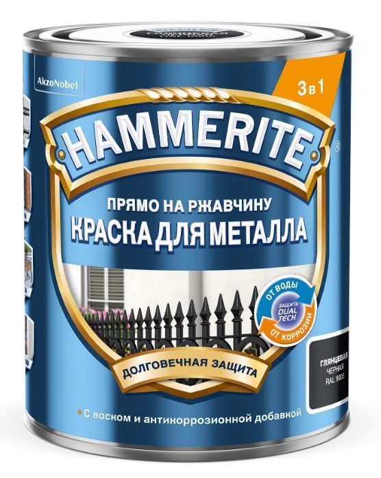 Краска для металлических поверхностей Хаммерайт (алкидная гладкая) черная 0,75л - специальная атмосферостойкая краска на алкидной основе, которая используется для окраски металлических поверхностей при внутренних и наружных работах. Уникальный материал, сочетающий свойства грунтовки, преобразователя ржавчины и декоративного финишного покрытия. Краска готова к применению, легко наносится, тиксотропная, не разбрызгивается и не образует подтёков, отличается превосходной укрывистостью, быстро высыхает. Используется по ржавым, окрашенным и неокрашенным основаниям из черных металлов - стальным, оцинкованным и чугунным. После предварительного грунтования краску можно наносить и на поверхности из цветных металлов (оцинкованных, алюминиевых), а также на твёрдый пластик. Область применения краски Hammerite обширна - ворота, гаражи, трубы, решётки, заборы и ограждения, садовый инвентарь и мебель, элементы декора. При производстве краски реализована технология Dual Tech, обеспечивающая двойную защиту металла от воды и коррозии. Краска содержит воск, антикоррозийные (фосфат цинка) и силиконовые добавки, которые эффективно противостоят влаге и загрязнениям. Финишное покрытие чешуйчатой структуры отличается эластичностью и износостойкостью, не растрескивается от перепадов температуры и влажности. Палитра Hammerite содержит несколько наиболее используемых цветов, в гладком, а также в молотковом варианте. Краска полностью готова к применению. Рекомендовано 2-3-слойное нанесение кистью со смешанным ворсом, валиком или распылителем с обязательной межслойной просушкой в течение 4 часов. Краска имеет очень экономичный расход - всего 10 кв.м/л. Банки объёмом 0.75 л хватит на покрытие площади до 7.5 кв.м в 1 слой.