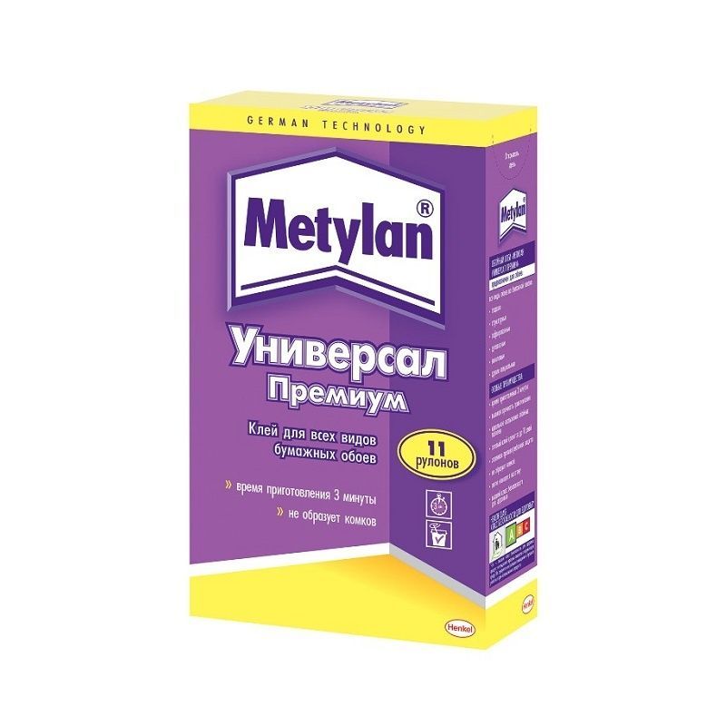 Клей Метилан Универсал Премиум (250г) - высококачественный, быстрорастворимый клей на основе модифицированного крахмала. Предназначен для всех видов бумажных обоев: гладких, структурных, гофрированных, дуплексных также подходит для виниловых и других специальных обоев.