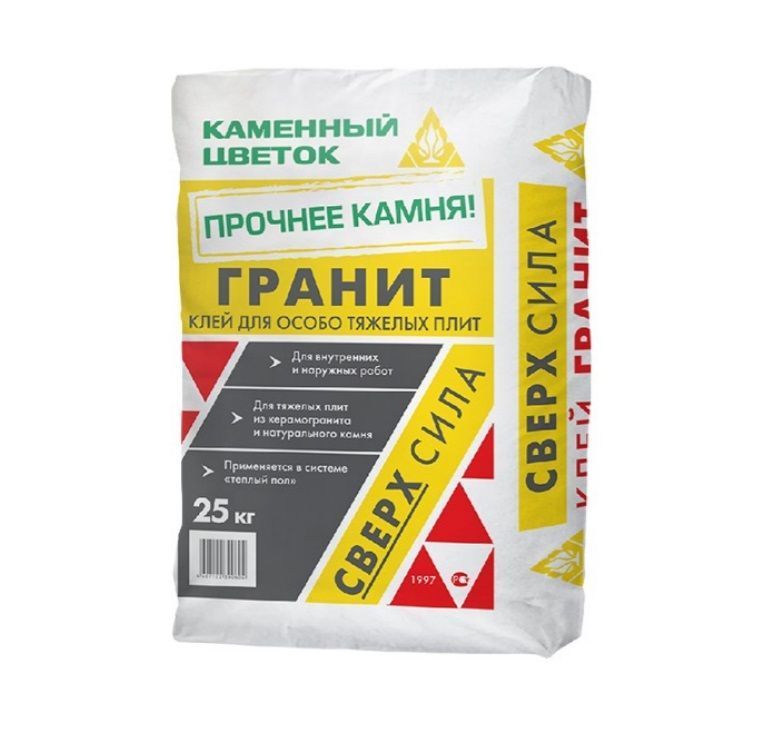Плиточный клей ТМ «Каменный цветок» «ГРАНИТ» предназначен для укладки тяжёлых плит из керамогранита, клинкерной плитки, натурального камня и керамики (вес до 800г/100с м² .) Используется для облицовки искусственных водоемов, чаш бассейнов, каминов. Рекомендуется для облицовки балконов, террас, цоколей, фасадов, полов с подогревом. Можно использовать для приклеивания теплоизоляционных плит (кроме экструдированного пенополистирола). Применяется в системе «теплый пол». Для внутренних и наружных работ.