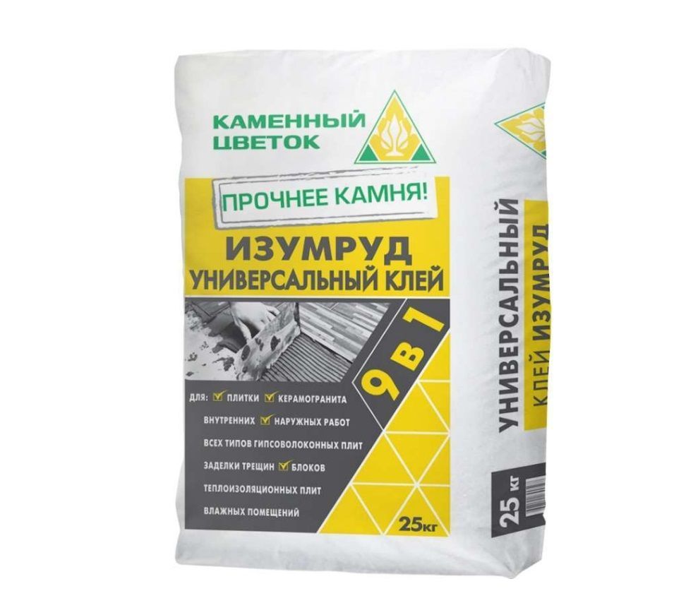 Плиточный клей ИЗУМРУД С1 цвет серый (25 кг) предназначен для облицовки без предварительного выравнивания стен и полов керамической плиткой, керамогранитом, искусственным и натуральным камнем (вес до 600г/100см²). Рекомендуется для облицовки балконов, террас, полов с подогревом, цоколей, фасадов. Для внутренних и наружных работ.