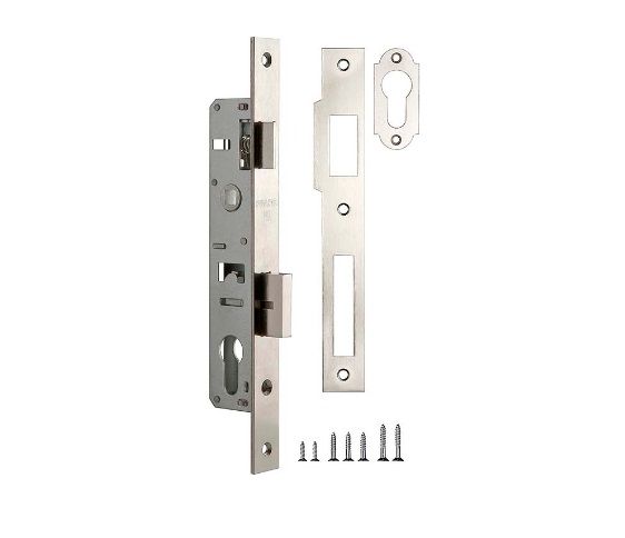 Корпус узкопрофильного замка с защелкой PROF153-20/85 (153-20/85) CP хром Fuaro (Фуаро) предназначен для установки в алюминиевые и пластиковые входные двери. Универсальная защелка позволяет устанавливать корпус замка в двери правого и левого открывания. Стальной оцинкованный корпус с отверстием под евроцилинд. Лицевая планка с гальваническим покрытием матовый хром. Ширина лицевой планки 23 мм. Размер бэксета 20 мм, размер межосевого расстояния 85 мм. Ответная планка и крепежная фурнитура в комплекте.
