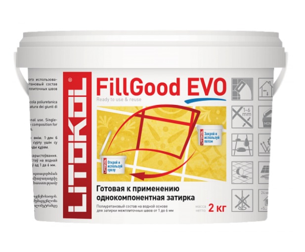 В отличие от двухкомпонентных реактивных эпоксидных продуктов, FillGood EVO позволяет избежать потери материала, дает больше времени для производства работ по затирке швов, идеально подходит для крупноформатной облицовки, где материал наносится только по периметру плитки. Подходит для следующих видов облицовок: керамическая плитка, керамогранит керамическая мозаика, керамогранитная мозаика металлическая мозаика, стеклянная мозаика натуральный камень, искусственный камень, агломерат.