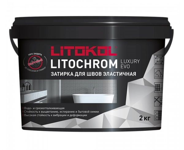 Литокол цементная затирочная смесь Litochrom Luxury EVO LLE.115 Светло-серый ведро 2кг - эластичная водоотталкивающая цементно-полимерная затирка с защитной системой LitoProtect для заполнения межплиточных швов шириной 1–10 мм включительно. Предназначена для затирки швов при облицовке стен и полов керамической плиткой, стеклянной мозаикой, керамогранитом, натуральным камнем, агломератом. Предназначена для затирки межплиточных швов, шириной от 1 до 10 мм внутри и снаружи помещений, при облицовке стен и полов: жилых помещений (санузлы, ванные, душевые, гостиные) общественных помещений (входные группы, МОП, медицинские, образовательные учреждения, супермаркеты, ТРЦ, бассейны) промышленных помещений (складские, производственные, подсобные помещения), где не предъявляются требования к химической стойкости швов и не предполагается контакт с агрессивными веществами балконов, террас и т. д. на деформирующихся основаниях таких как гипсоволокнистые листы (ГВЛ), гипсокартон (ГКЛ), стекломагнезитовые листы (СМЛ) цементные стяжки с водяным и электрическим подогревом. Подходит для следующих видов облицовок: керамическая плитка, керамическая, стеклянная мозаика, керамогранит, керамогранитная мозаика, натуральный камень (невпитывающий), искусственный камень, агломерат. Преимущества: ярко выраженные водоотталкивающие свойства (эффект «капли» на поверхности при контакте с водой) высокая эксплуатационная стойкость к механическим воздействиям, деформационным и истирающим нагрузкам (интенсивные пешеходные нагрузки, перемещение мебели) 100% защита от плесени и грибка стойкость и однородность цвета на протяжении всего срока эксплуатации стойкость к перепадам температур легкая обработка и высокая эстетичность швов.