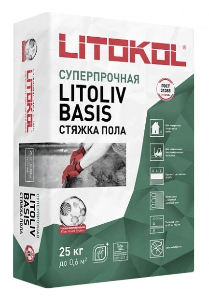 Литокол ровнитель д/пола LitoLiv Basis 25кг - ровнитель для пола на цементной основе. Высокопрочный, влаго-, морозостойкий. Толщина слоя от 20 мм до 80 мм. Для внутренних и наружных работ. Для «тёплых» полов. LitoLiv Basis - сухая смесь на основе цементного вяжущего, минеральных наполнителей и модифицирующих добавок. После затворения водой образует пластичный однородный раствор, легко выравнивающийся на горизонтальной поверхности. Основные преимущества: быстрый набор прочности высокая адгезия с традиционными строительными минеральными основаниями высокая механическая прочность на изгиб и сжатие после высыхания влагостойкий