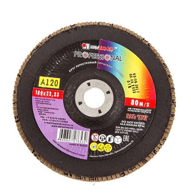 Диск лепестковый по металлу ЛУГА (180х22мм) Р120 (5/40) - это специальная насадка в форме диска на шлифовальную машинку, болгарку, стационарные станки и другое электрооборудование. Изделия применяют в строительстве, ремонте, производстве, автомобильной сфере для полировки, зачистки, финишной шлифовки различных поверхностей. предназначен для установки на точильные станки для плоского шлифования и обработки кромок и сварных швов деталей и конструкций из различных марок сталей, цветных металлов и древесины.