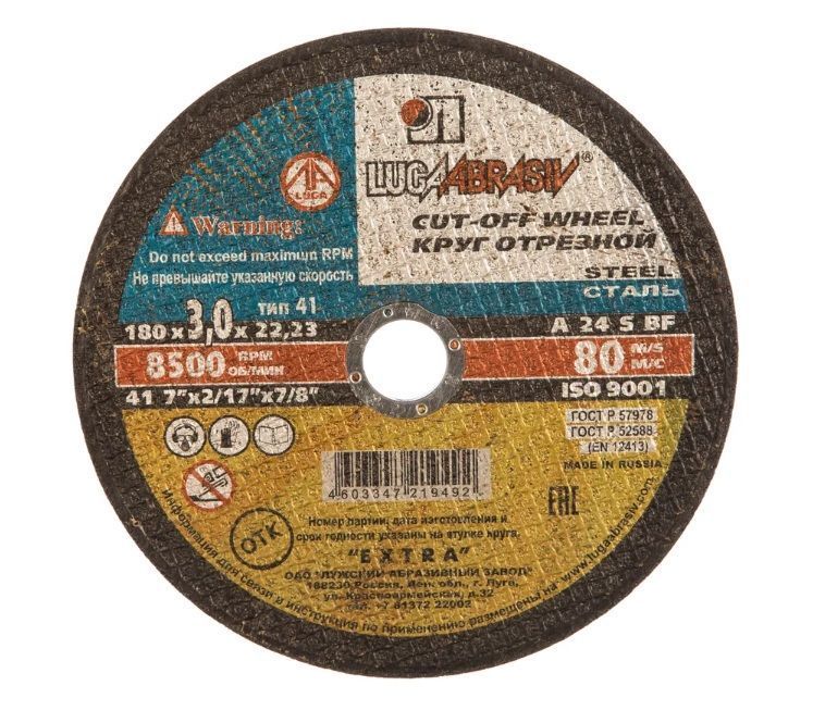 Диск (круг) отрезной армированный изготовлен из электрокорунда нормального марки 14А на основе бакелитовой связки с армированием. Используется на УШМ, соответствующего типоразмера и предназначен для резки деталей и конструкций из различных марок сталей.