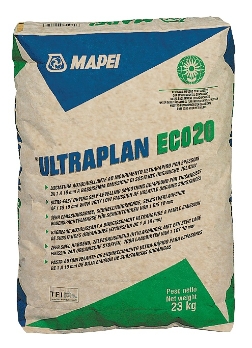Мапеи самовырав.шпатлевка д/пола Ultraplan Eco 20 23кг - самовыравнивающийся быстросхватывающийся состав с очень низкой эмиссией летучих органических соединений для тонкослойного финишного выравнивания от 1 до 10 мм. Создает прочное (> 20 МПа) и ровное основание под укладку гибких напольных покрытий, LVT-плитки. Готовность к лёгким пешим нагрузкам – от 3 часов укладка финишного декоративного покрытия – от 48 часов в зависимости от вида покрытия и условий окружающей среды. Для жилого и коммерческого типа зданий