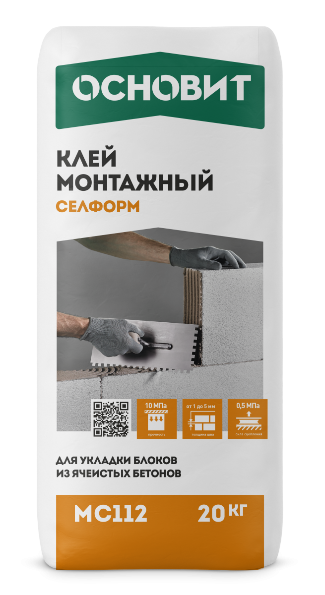 Клей монтажный ОСНОВИТ СЕЛФОРМ MC112 (старое название Т-112) предназначен для кладки стен и перегородок из блоков и плит на основе ячеистого бетона (пено- и газобетон), газосиликата и силиката. Используется для тонкослойной кладки пазовых и беспазовых блоков. Для внутренних и наружных работ.