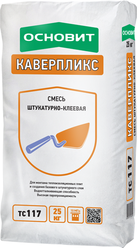Штукатурно-клеевая смесь ОСНОВИТ КАВЕРПЛИКС ТС 117 (старое название Т-117) предназначена для монтажа пенополистирольных и минераловатных плит, создания армированного базового штукатурного слоя.