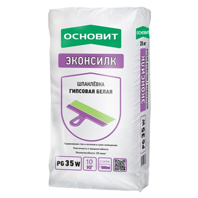 Шпаклевка гипсовая белая ОСНОВИТ ЭКОНСИЛК PG35 W (старое название Глэдсилк Т-35) состоит из гипса, модифицирующих добавок и наполнителя. Применяется для выравнивания стен и потолков, для заделки швов ГКЛ и ГВЛ. Рекомендуется под последующее нанесение декоративных покрытий. Для внутренних работ.