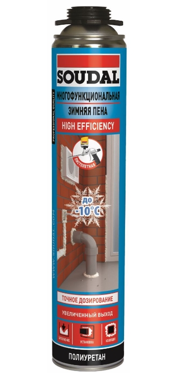 Многофункциональная пена Soudal зимняя – это бытовая однокомпонентная саморасширяющаяся полиуретановая пена с увеличенным выходом и малым временем отверждения. Температура применения – до -10°C.