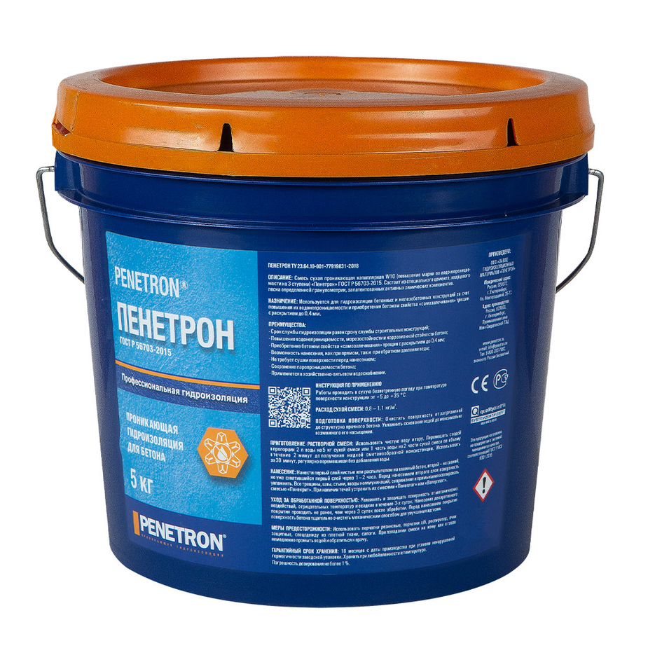 Гидроизоляционная смесь Пенетрон (5кг) используется для проникающей гидроизоляции поверхностей сборных и монолитных бетонных и железобетонных конструкций, в том числе оштукатуренных цементно-песчаным раствором (фундаменты, подвалы, резервуары, колодцы, бассейны, отмостки, бетонные площадки и т.д.). Предотвращает проникновение воды сквозь бетон.