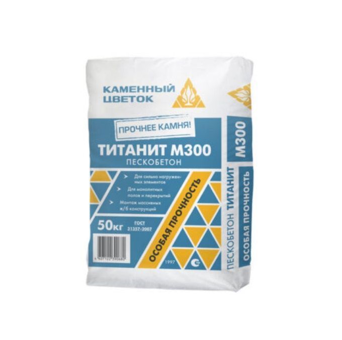 ТИТАНИТ Пескобетон М300+ (50 кг) предназначен для изготовления черновых стяжек пола, кладки кирпича, бетонных блоков, ремонта полов и стен, бетонирования лестниц, изготовления легких фундаментов, монтажа ж/б конструкций и заделки швов. Основания должно быть прочным, очищенным от пыли, жировых загрязнений, смазочных масел, лакокрасочных покрытий и других веществ, снижающих сцепление. Основание необходимо подготовить с помощью соответствующего грунта ТМ «Каменный Цветок».