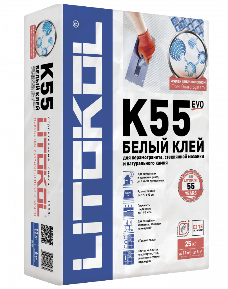Litokol LitoPlus K55 предназначен для наружной и внутренней облицовки стеклянной, керамической и каменной мозаикой, керамогранитом, а также керамической плиткой и плиткой из натурального камня размером до 60х60 см. Так как клей белого цвета, он особенно рекомендуется при укладке цветной и прозрачной стеклянной мозаики, а также плитки из натурального белого камня, поскольку не меняет исходный цвет материала.