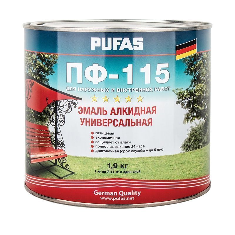 Эмаль Pufas ПФ-115 ГОСТ предназначена для наружных и внутренних работ. Образует прочное однородное глянцевое атмосферостойкое покрытие, обладающее защитными и декоративными свойствами. Устойчиво к мытью и истиранию, воздействию растворов моющих средств. Скрывает мелкие дефекты поверхности. Легко наносится, хорошо растекается. Поверхности: деревянные, металлические, минеральные, гипсокартонные, ДСП и ДВП, фанера, МДФ, OSB (стены, лестницы, оконные рамы, заборы, ворота и пр).