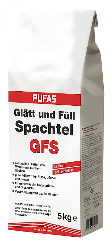 PUFAS Glätt+Füll Шпаклёвка для выравнивания и заполнения размешанная с водой, образует устойчивую шпаклёвочную массу, которую можно наносить на поверхность слоем толщиной до 15 см и толщина слоя может быть снята до нуля.