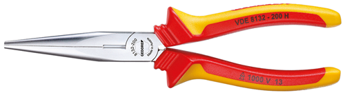 Длинногубцы стальные SB VDE 8132-200 H VDE зазубренные имеют длинные, плоские, круглые челюсти, прямые захватные поверхности. Используются для удерживания, захвата, сгибания и резки. Имеют Прецизионные режущие кромки с индукционной закалкой, твердость 61 - 63 HRC, ручки с изолирующими втулками VDE до 1000 В, согласно EN 60900/IEC 60900. Материал: Специальная закаленная и отпущенная сталь GEDORE, кованая, закаленная в масле и отожженная.