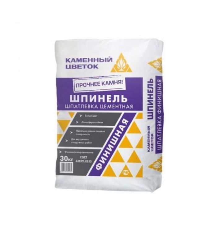 Финишная цементная шпатлевка ШПИНЕЛЬ цвет белый (30 кг) изготовлена на цементной основе, белого цвета, предназначена для внутренних работ для сухих и влажных помещений, а также для наружных работ, для фасадов. Перед нанесением шпатлевки Каменный цветок ШПИНЕЛЬ необходимо удалить с поверхности пыль, масляные пятна и другие загрязнения, препятствующие сцеплению материала с поверхностью. Значительные неровности целесообразно выровнять соответствующей штукатуркой.