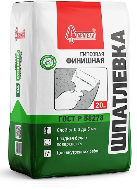 ГОСТ Р 58278 Старатели Шпатлевка гипсовая Финишная - для высококачественного финишного выравнивания стен и потолков внутри помещений с нормальным уровнем влажности. Рекомендуется для склеивания и шпатлевания гипсовых элементов (лепнины)