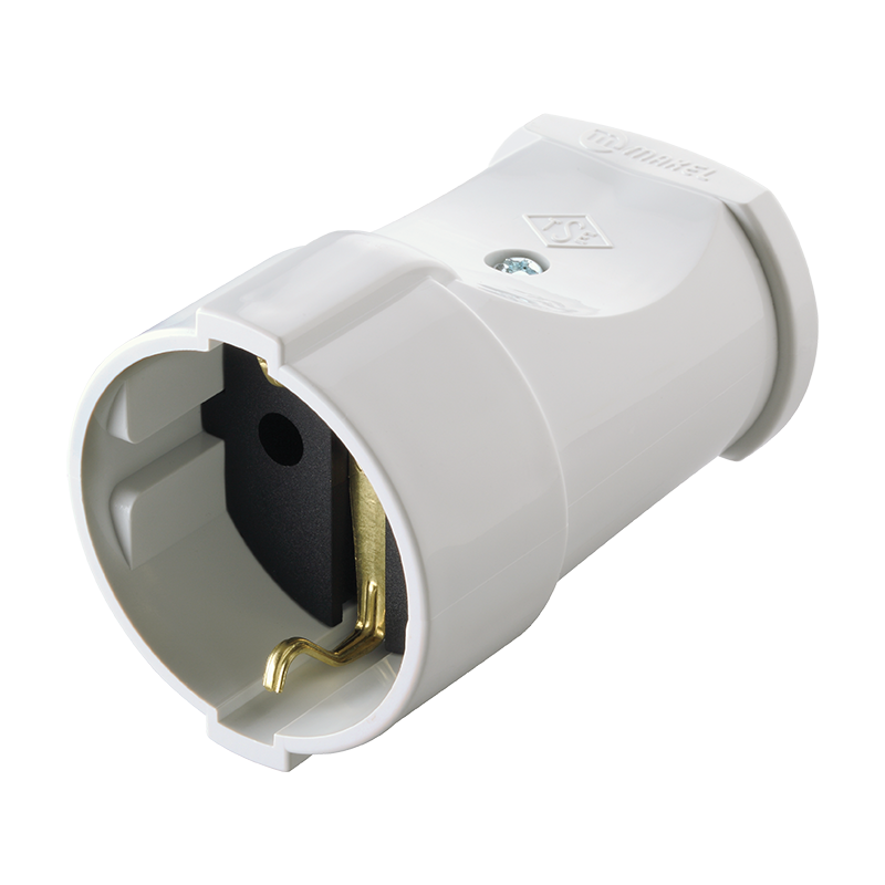Штепсель 1 гнездо с заземлением белый (10003) изготовлен из ударопрочного пластика белого цвета. Изделие служит для подключения бытовых электроприборов к сети. Оснащено одним гнездом и работает при номинальном токе в 16 А. Предусмотрено заземление.