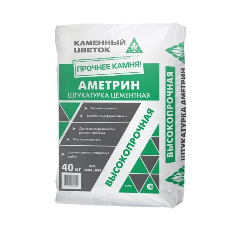 Базовая цементная штукатурка АМЕТРИН Высокопрочная предназначена для выравнивания стен из бетона, кирпича, пено – и газобетона. Рекомендуется для отделки фасадов выше цокольной части и помещений с любой степенью влажности. Для ручного и механизированного нанесения. Для внутренних и наружных работ. Рекомендуемые основания: бетонные, кирпичные, пено- и газобетонные основания, цементные штукатурки.