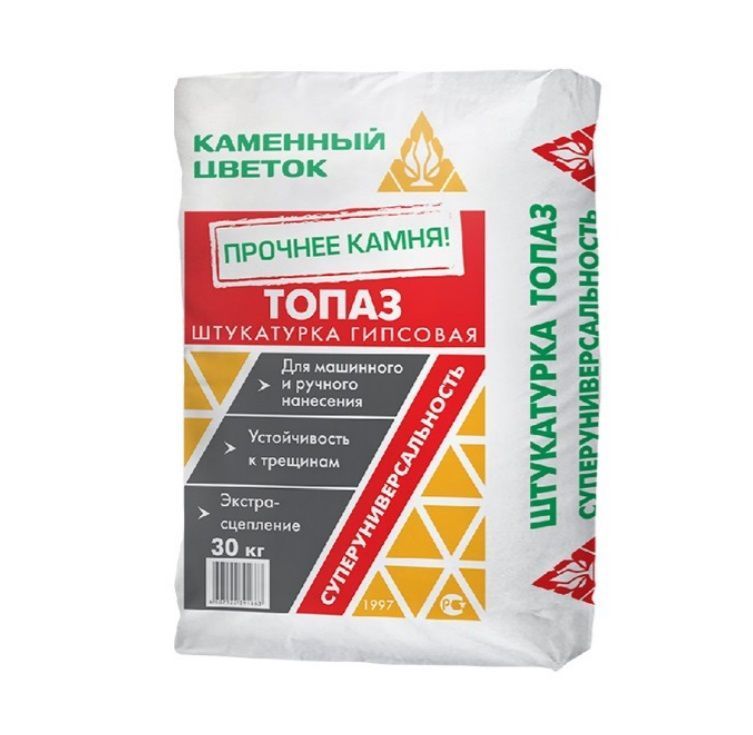 Гипсовая штукатурка Топаз серая для отделки сухих внутренних помещений. Для высококачественного оштукатуривания стен и потолков по пенобетонным, газосиликатных и прочим пористым основаниям подготовка основания под покраску, оклейку обоями также возможно применять на типичных минеральных основаниях. На гипсовой основе. Для работ в помещениях с нормальной влажностью. Однослойное сплошное нанесение до 20 мм за 1 раз. Локальное выравнивание до 50 см. Стойкость к трещинообразованию. Повышенные тепло и звукоизоляционные свойства. Создается комфортный режим влажности в обработанном помещении. Эластичен при нанесении.