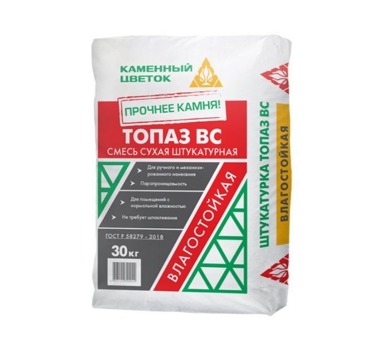 Гипсовая штукатурка Топаз ВС серая предназначена для выравнивания стен и потолков в помещениях с нормальной влажностью. Для ручного и механизированного нанесения. Для внутренних работ. Рекомендуемые основания: Пено- и газобетонные. Кирпичные. Бетонные. Гипсовые основания. ГКЛ, ГВЛ, ЦСП. Не требует шпаклевания. Перед нанесением штукатурки необходимо удалить с поверхности пыль, масляные пятна и другие загрязнения, препятствующие сцеплению материала с поверхностью. Гладким и глянцевым поверхностям необходимо придать шероховатость. Для усиления прочности сцепления материала с основанием поверхность обработать соответствующим грунтом ТМ «Каменный цветок». При необходимости нанести грунтовку в несколько слоев. Основание готово к нанесению штукатурки только после полного высыхания грунта. Не допускать запыления загрунтованных поверхностей.