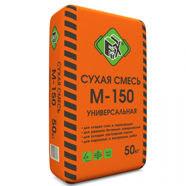 Смесь сухая универсальная М150 FIX (50 кг) - применяется для выполнения кладочных работ, первичной штукатурки стен, ремонта и заделки швов, выбоин, трещин, щелей. Используется для наружных и внутренних работ.