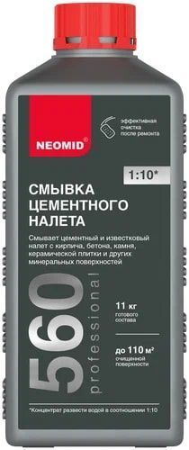 Смывка цементного налета Neomid 560 -эффективное средство для удаления цементных, известковых и гипсовых загрязнений. Применяется для очистки поверхности после строительных работ, а также для удаления бытовых загрязнений с керамических плиток, кирпича, раковин, ванн и подобных поверхностей. Применять для поверхностей, устойчивых к воздействию кислот.