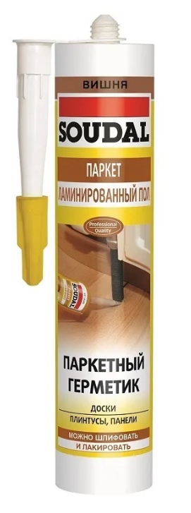 Герметик Soudal Parquet Sealant на основе водной дисперсии акриловых смол разных цветов, соответствующих самым популярным видам паркета.