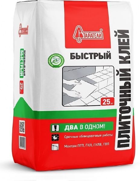 Старатели Клей плиточный Быстрый для срочных облицовочных работ. Для укладки керамической плитки (глазурованная, неглазурованная, терракотовая, мозаичная) на стены и пол в помещениях с нормальной влажностью. Применяется по прочным недеформирующимся основаниям. Может использоваться для возведения перегородок из ПГП, а также монтажа и склеивания ГКЛ, ГВЛ.