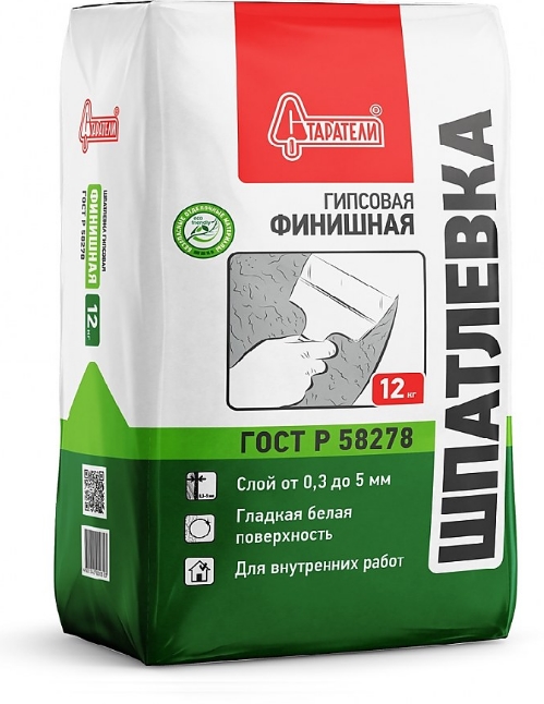 ГОСТ Р 58278 Старатели Шпатлевка гипсовая Финишная - для высококачественного финишного выравнивания стен и потолков внутри помещений с нормальным уровнем влажности. Рекомендуется для склеивания и шпатлевания гипсовых элементов (лепнины)
