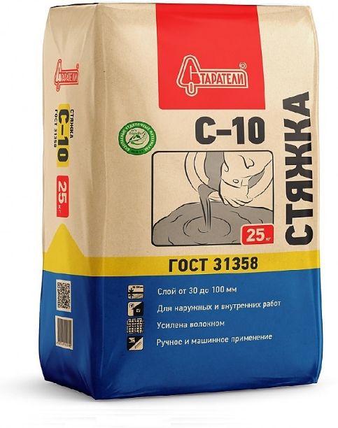 ГОСТ 31358 Старатели Стяжка пола С-10 - универсальная стяжка, обладающая хорошей пластичностью. Применяется для базового выравнивания бетонных и цементно-песчаных оснований под последующую укладку напольных покрытий или финишное выравнивание тонкослойными наливными полами марки «Старатели». Подходит для формирования уклонов и устройства стяжек на разделительном слое. Используется в помещениях с нормальной и повышенной влажностью (в том числе неотапливаемых), а также для наружных работ.