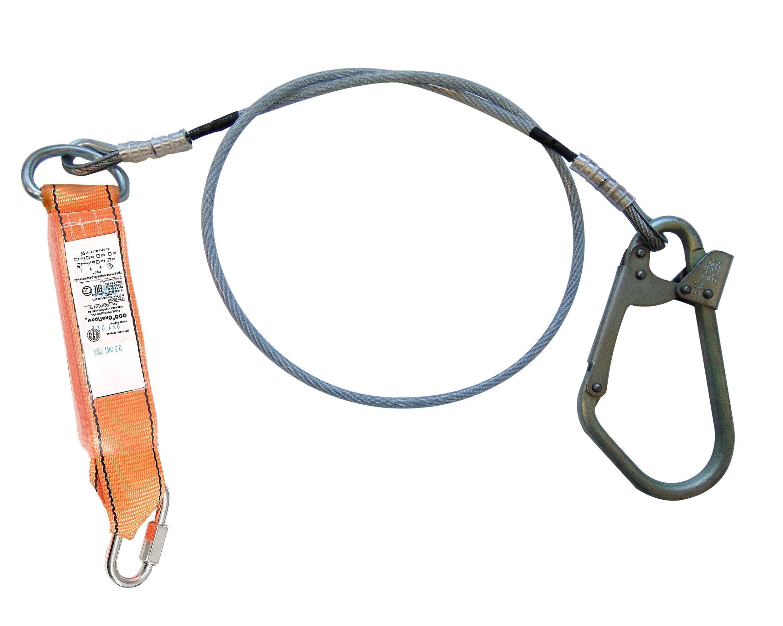 Строп аБ + Кс (трос, вар. 2) - строп для удержания и страховки при выполнении высотных работ. Представляет собой фал из стального троса в ПВХ-оплётке с амортизатором рывка, большим монтажным карабином класса А и соединительным винтовым карабином класса Q.