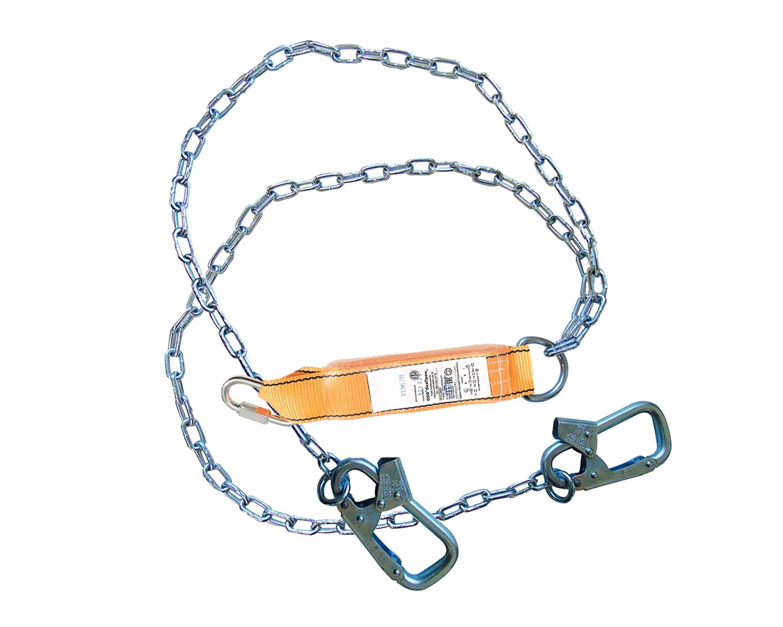 Строп аГд + Кс (цепь) - строп для удержания и страховки при выполнении высотных работ. Представляет собой двуплечий фал из оцинкованной стальной цепи с амортизатором рывка, 2-мя малыми монтажными карабинами класса Т и соединительным винтовым карабином класса Q.