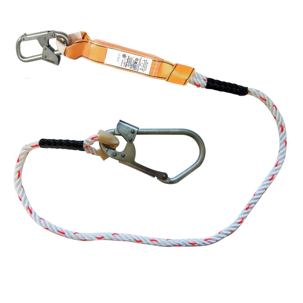 Строп аВ + К25 (канат, вар. 2) - строп для удержания и страховки при выполнении высотных работ. Представляет собой фал из 3-х прядного полиамидного каната с амортизатором рывка, малым монтажным карабином класса Т и большим монтажным карабином класса А.