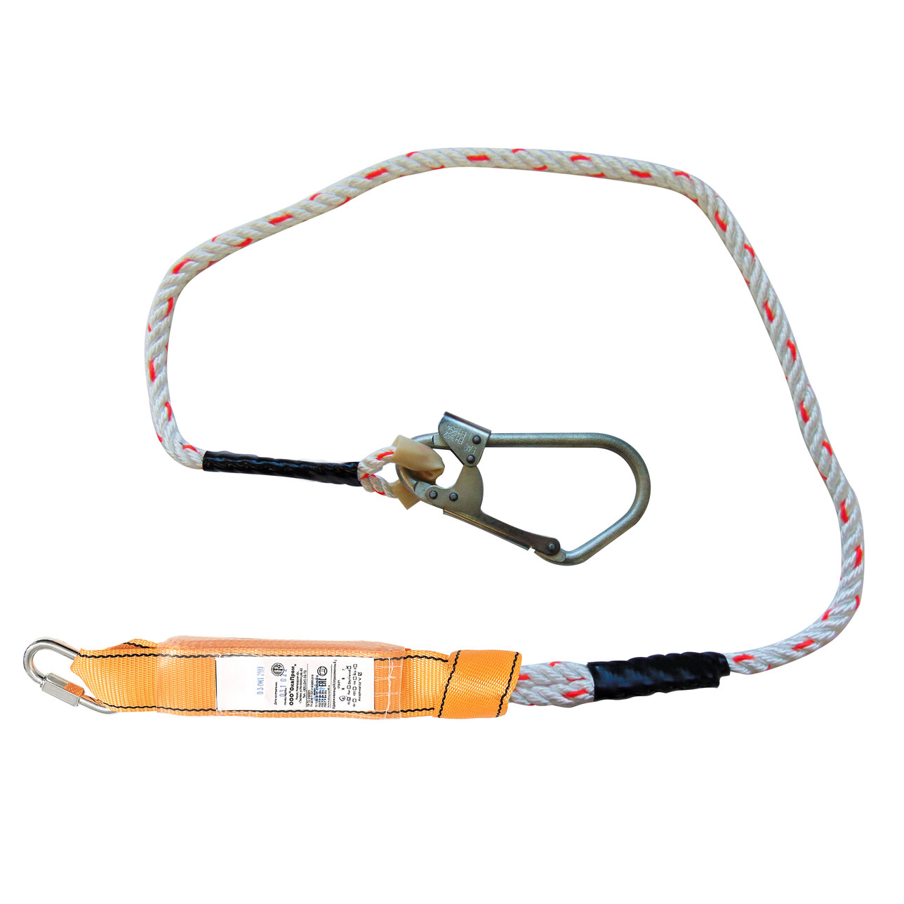 Строп аВ + Кс (канат, вар. 2) - строп для удержания и страховки при выполнении высотных работ. Представляет собой фал из 3-х прядного полиамидного каната с амортизатором рывка, большим монтажным карабином класса А и соединительным винтовым карабином класса Q.